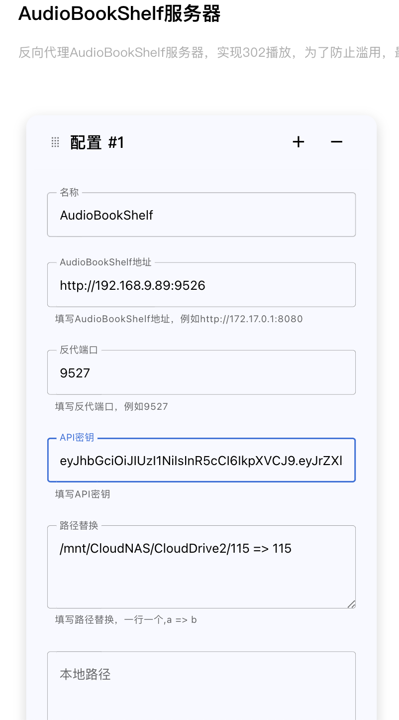 AudioBookShelf 302 配置方式与 Emby 基本相同,主要区别在于需要部署支持 Strm 格式的魔改版 AudioBookShelf 镜像。