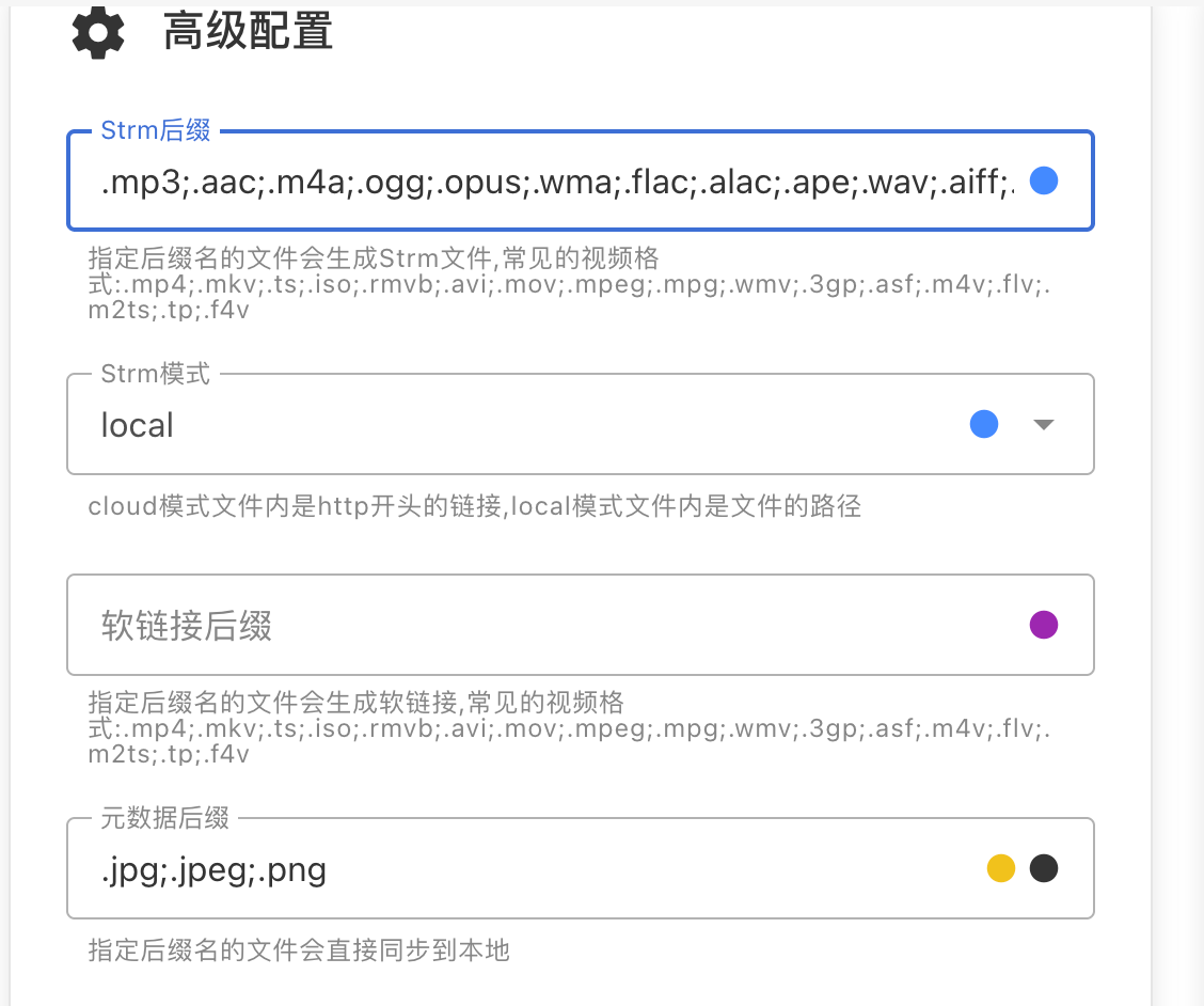 在高级设置中,将以下常见音乐格式添加到 Strm 后缀: