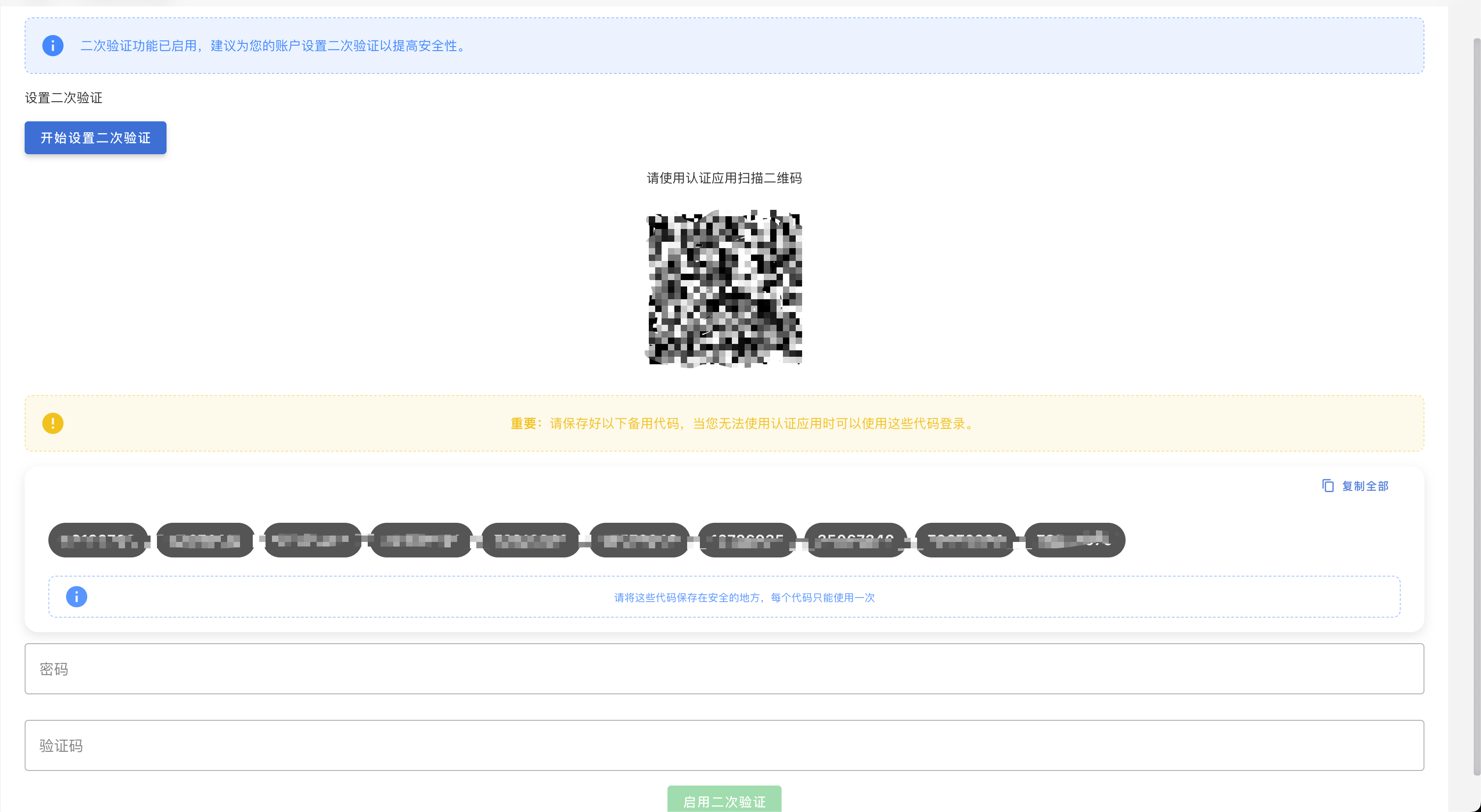 请务必保存备用恢复代码! 这些代码是将来恢复访问权限的唯一方式,请妥善保管在安全的地方。