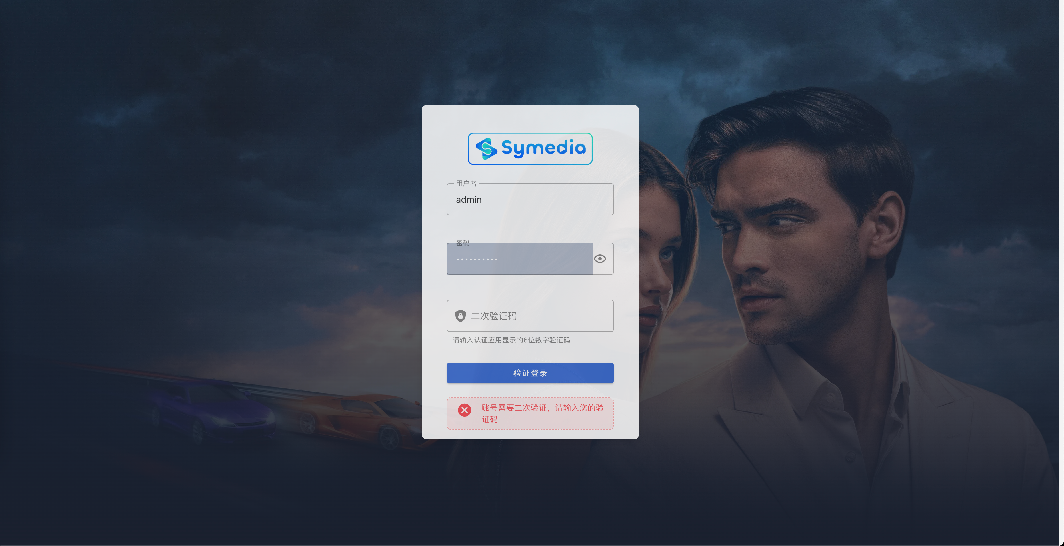 设置完成后,下次重新登录 Symedia 时,系统会要求输入二次验证码进行身份验证。